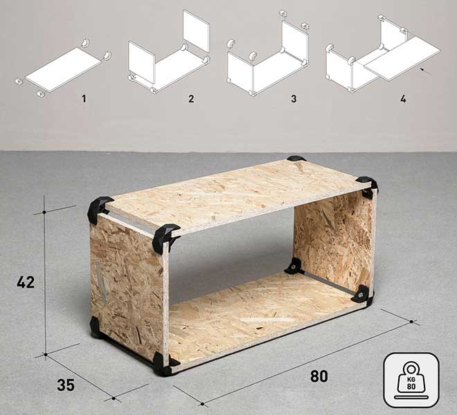Mobile in kit con giunzioni colorate assemblabile senza viti disponibile in diversi materiali.